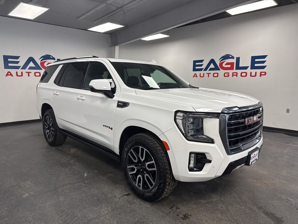 CARFAX One-Owner. Clean CARFAX. Summit White 2023 GMC Yukon AT4 4WD 10-Speed Automatic with Overdrive EcoTec3 5.3L V8 4X4, Navigation, Power Windows & Locks, Power Seat, Dual Climate Control, 3rd Row Seat, Alloy Wheels, Remote Start, Cruise Control, BlueTooth Compatible, Reverse Back up Camera, 4WD, 15" Diagonal Multi-Color Head-Up Display, 2 Presets For Outside Rearview Mirrors, 3 Years of GMC Connected Services, 3 Years of OnStar Safety & Security, 3rd Row 60/40 Power-Folding Split-Bench Seat, Black Roof-Mounted Luggage Rack Side Rails, Bose 9-Speaker Stereo Audio System Feature, Bright Front & Rear Door Sill Plates, Front High-Approach Angle Fascia, Hands-Free Power Programmable Rear Liftgate, HD Surround Vision, Heated & Ventilated Driver & Front Passenger Seats, Heated 2nd Row Outboard Position Seats, Heated Driver & Front Passenger Seats, Heated Steering Wheel, Heavy-Duty Air Filter, Hill Descent Control, Inside Rear-View Auto-Dimming Mirror, Navigation System, Outside Heated Power-Adjustable Mirrors, Power Release 2nd Row 60/40 Split-Folding Bench Seat, Power Tilt & Telescopic Steering Column, Preferred Equipment Group 4SB, Rear Pedestrian Alert, Red Horizontal-Mounted Recovery Hooks, Safety Alert Seat, Technology Package, Universal Home Remote, Wireless Charging.